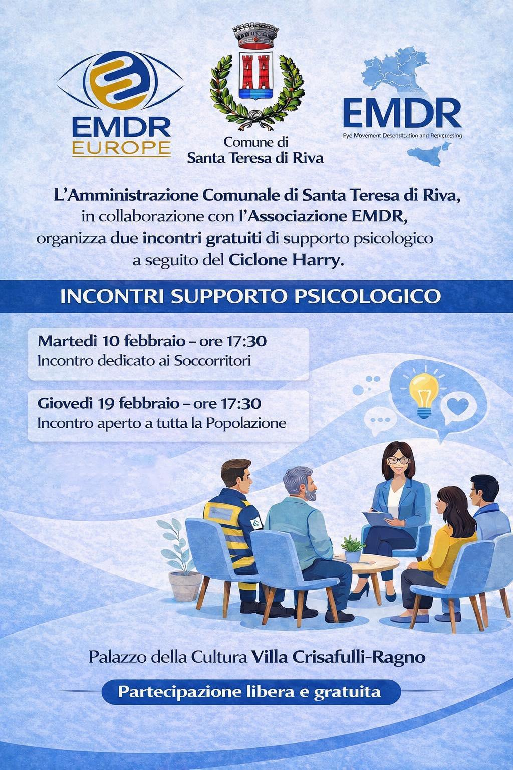 L'Amministrazione Comunale di Santa Teresa di Riva, in collaborazione con l'Associazione EMDR organizza due incontri gratuiti di supporto psicologico a seguito del Ciclone Harry.
