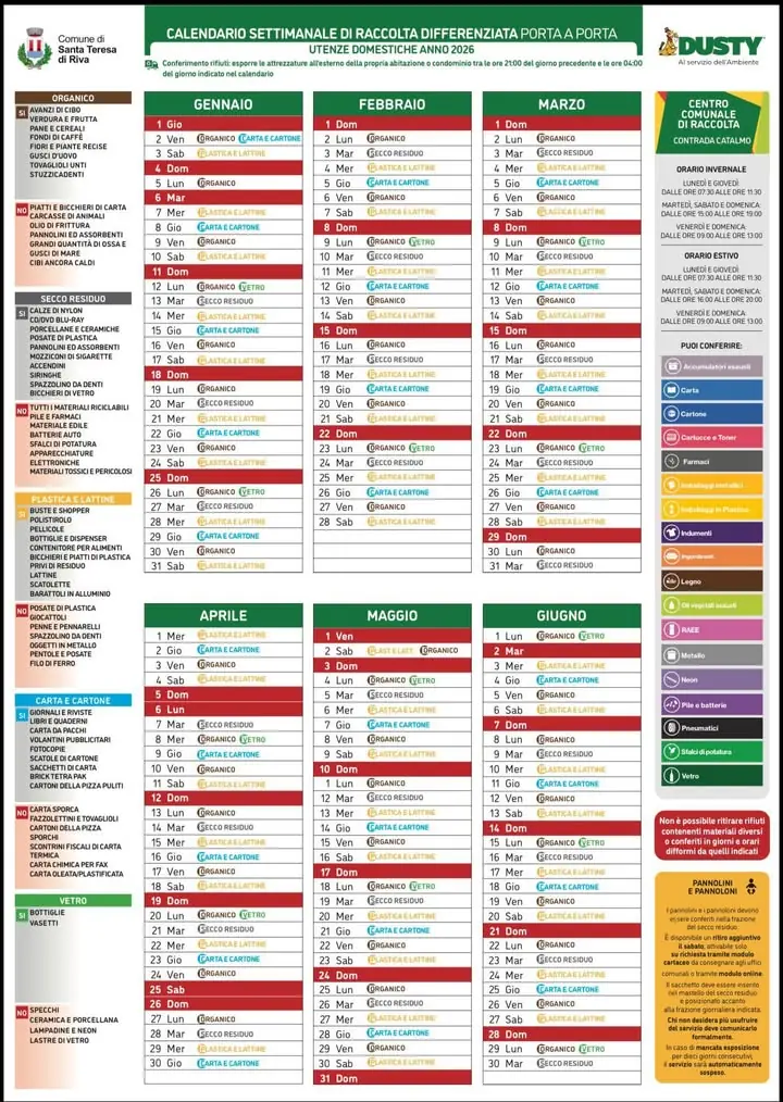 Si avvisa la cittadinanza che giovedì 18 dicembre verrà consegnato nei mastelli blu il calendario delle utenze domestiche 2026. ( in caso di pioggia sarà consegnato giorno 26, resta invariato quello per le utenze commerciali) Qualora non lo riceviate , lo troverete da venerdì 19 dicembre al CCR . L’